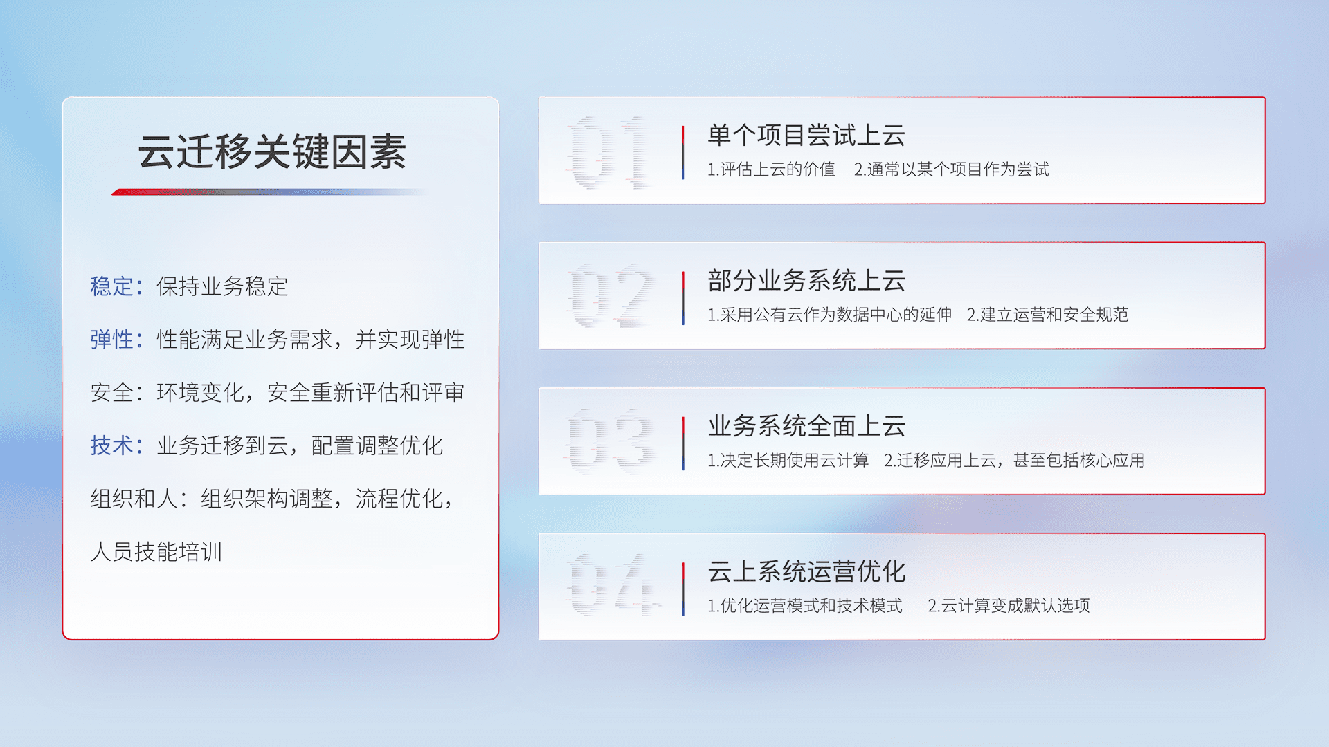 结合实际业务,,从规划设计、、、云平台选型、、云原生改造、、、数据迁移、、、、集成交付,,迁移全过程为客户识别最佳上云路径,,做好风险识别管理,,设计网络架构、、、、身份权限、、、安全审计合规、、操作审计、、、、日志审计、、、、监控告警策略、、多站点容灾设计等,,,,对云上基础设施进行整体规划,,,提升IT治理水平,,,,以满足弹性、、高可用、、高性能的需求。。