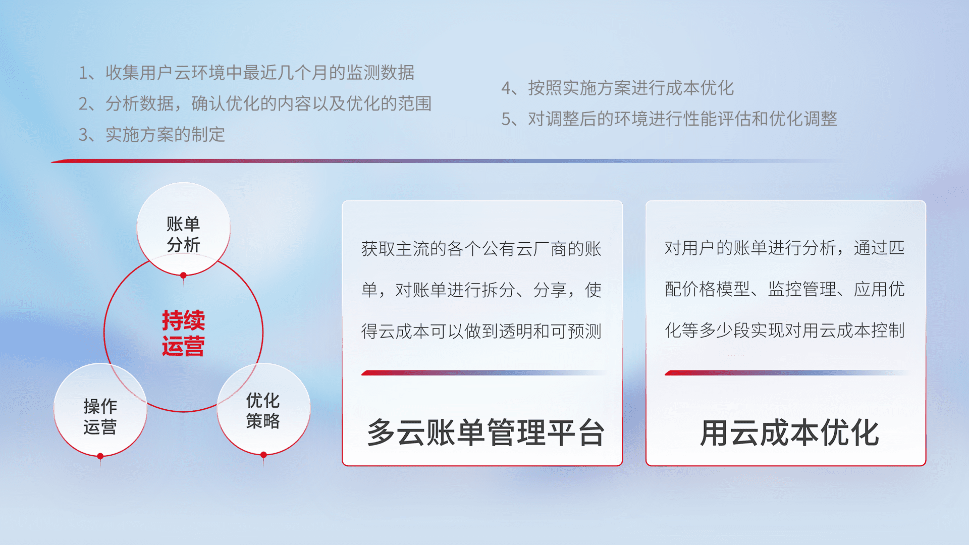 通过多云纳管,,以统一的资源数据模型把客户的云资源进行抽象和封装,,进而实现对多云资源的统一操作,,,保障云资源管理的可靠性、、、稳定性与可用性。。量身定制化运维内容,,,配置、、、、开发运维、、、补丁管理、、备份、、、监控、、、、认证和访问管理、、审计和日常巡检等,,,保障在用云过程中的可靠度,,,稳定度以及高可用率。。